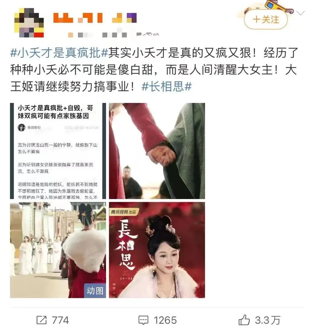 在《長(zhǎng)相思》里,原本玱玹的“霸總”人設(shè)也被重構(gòu),從溫情的“寵妹狂魔”,逐漸過(guò)渡到愛(ài)而不得的“瘋批”,每一個(gè)階段的人設(shè)都能被觀眾接受,也更適配當(dāng)下觀眾的取向。