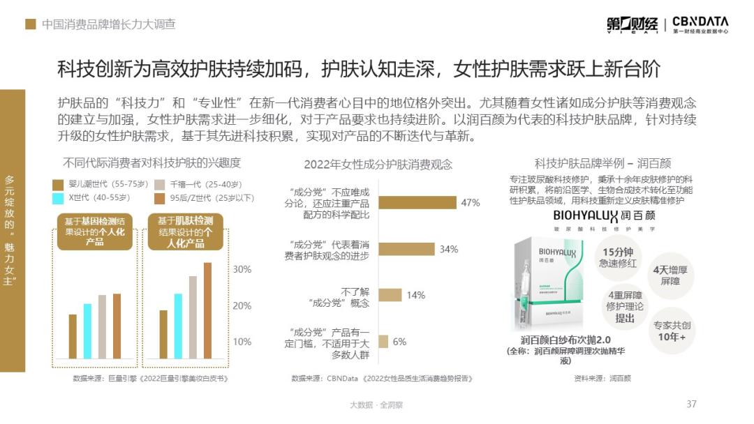 在護膚領(lǐng)域,隨著女性消費者護膚觀念的升級,護膚品的選擇水平也越來越多樣化,迎來了從最初的“品牌理論”到“成分黨”再到“重視配方合理性”的轉(zhuǎn)變。根據(jù)CBNData的調(diào)查,47%的女性認為“成分黨”不僅要注重成分理論,還要注重產(chǎn)品配方的科學比例。“科技力量”和“專業(yè)性”逐漸被放在護膚品消費決策的關(guān)鍵位置。