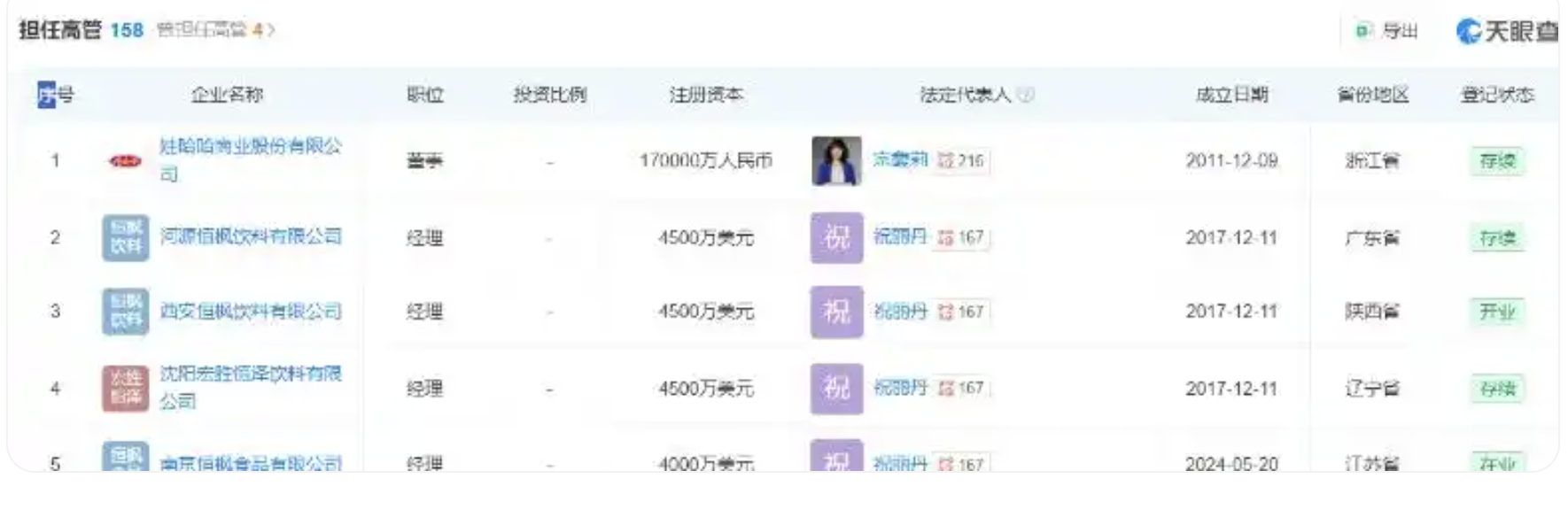 目前,祝麗丹任在158家娃哈哈系宏勝系公司中擔(dān)任法定代表人和高管。