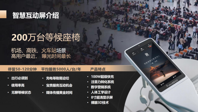 座聯(lián)互動—智慧扶手互動媒體屏,搶占出行流量聚集場景!座聯(lián)互動是搶占機場、火車站場景,鋪設(shè)智能扶手互動媒體屏。搶占高凈值流量資源,用戶歡迎,場景追捧。以用戶充電需求為基礎(chǔ),免費和付費充電雙兼?zhèn)?,同時覆蓋航班查詢、瀏覽資訊、娛樂互動及廣告&流量服務(wù),賦能機場高鐵等高端場景,計劃2024年第四季度推出場站新零售,為用戶提供場景化服務(wù),通過智慧化硬件讓出行更美好。已獲得前海靜安投資,未來發(fā)展勢頭強勁!>>> 點擊查看項目詳情,搶占區(qū)域獨家合作機會
