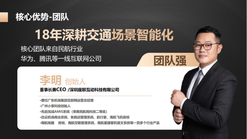 創(chuàng)始人李明多年深耕交通場景智能化,其核心團隊來自民航行業(yè)、華為、騰訊等一線互聯(lián)網(wǎng)公司,有多年大交通場景的運營實戰(zhàn)經(jīng)驗。