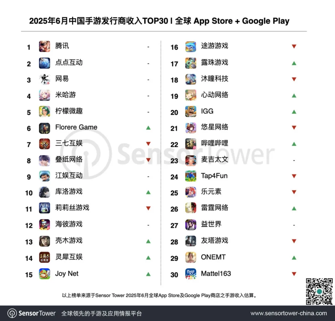 2025年6月,騰訊《王者榮耀》、《和平精英》與點(diǎn)點(diǎn)互動(dòng)《無(wú)盡冬日》穩(wěn)居中國(guó)App Store手游收入榜前3名。