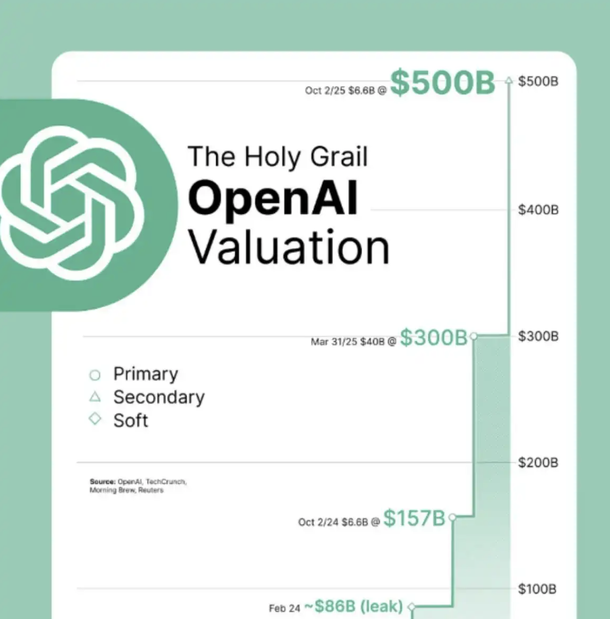 本月初,OpenAI完成規(guī)模約66億美元的股份轉讓交易,公司估值達到驚人的5000億美元。OpenAI現(xiàn)已成為全球估值最高的初創(chuàng)公司,超越SpaceX和字節(jié)跳動。自2022年底ChatGPT將生成式人工智能帶入公眾視野以來,OpenAI的估值一路飆升。2023年初,公司估值約為290億美元。2024年10月,OpenAI完成一筆66億美元的融資,由美國新銳風投Thrive Capital領投,微軟繼續(xù)參投,英偉達、軟銀首次投資,此時公司的估值達到1570億美元。2025年3月,在軟銀領投的一輪400億美元融資完成后,OpenAI的估值已經飆升至3000億美元。