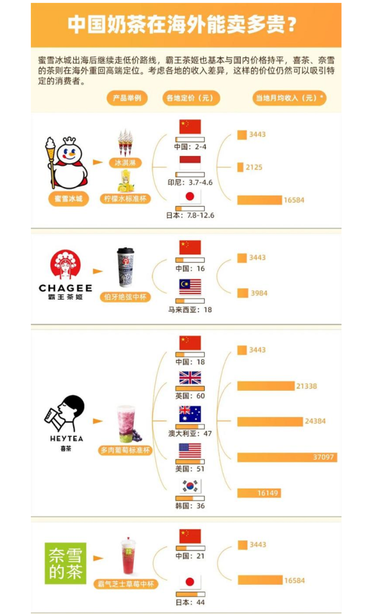 十多年前,中國的奶茶店就把目光投向了海外。2009年貢茶進(jìn)軍新加坡,2010年快樂檸檬去了菲律賓,2011年CoCo都可勇闖北美......又過了幾年,喜茶、奈雪的茶、蜜雪冰城等頭部品牌紛紛開啟航程,不約而同將東南亞作為了目標(biāo)市場。在定價策略上,蜜雪冰城延續(xù)了一貫的密集開店策略,繼續(xù)用低價吸引大眾。霸王茶姬也基本與國內(nèi)價格持平。喜茶則“重塑金身”,在英國門店里,經(jīng)典產(chǎn)品多肉葡萄能賣到60元一杯,在美國、澳大利亞也是50元左右的定價。>>>點擊查看詳情