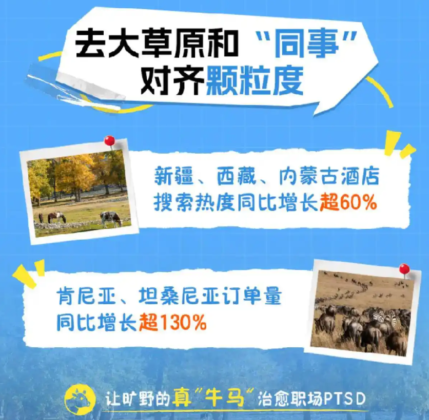 攜程數(shù)據(jù)顯示,“工位主理人”今年偏愛前往新疆、西藏、內(nèi)蒙古等草原、森林自然景觀繁盛的遠(yuǎn)途目的地。這些地區(qū)的酒店搜索熱度同比上升60%,客源多來自一線及新一線城市。為了“看草原”,國內(nèi)游客甚至將目光投向了更遙遠(yuǎn)的非洲地區(qū)??夏醽喓吞股D醽?,十一黃金周假期訂單同比增長了130%。草原之外,“文化游”主題旅行同樣熱度攀升?!?0后”解鎖了更多文化新玩法:如體驗小眾民族妝造、跟非遺傳承人學(xué)手藝、住早市附近酒店、探秘工業(yè)遺址、做復(fù)原妝造打卡古建等。