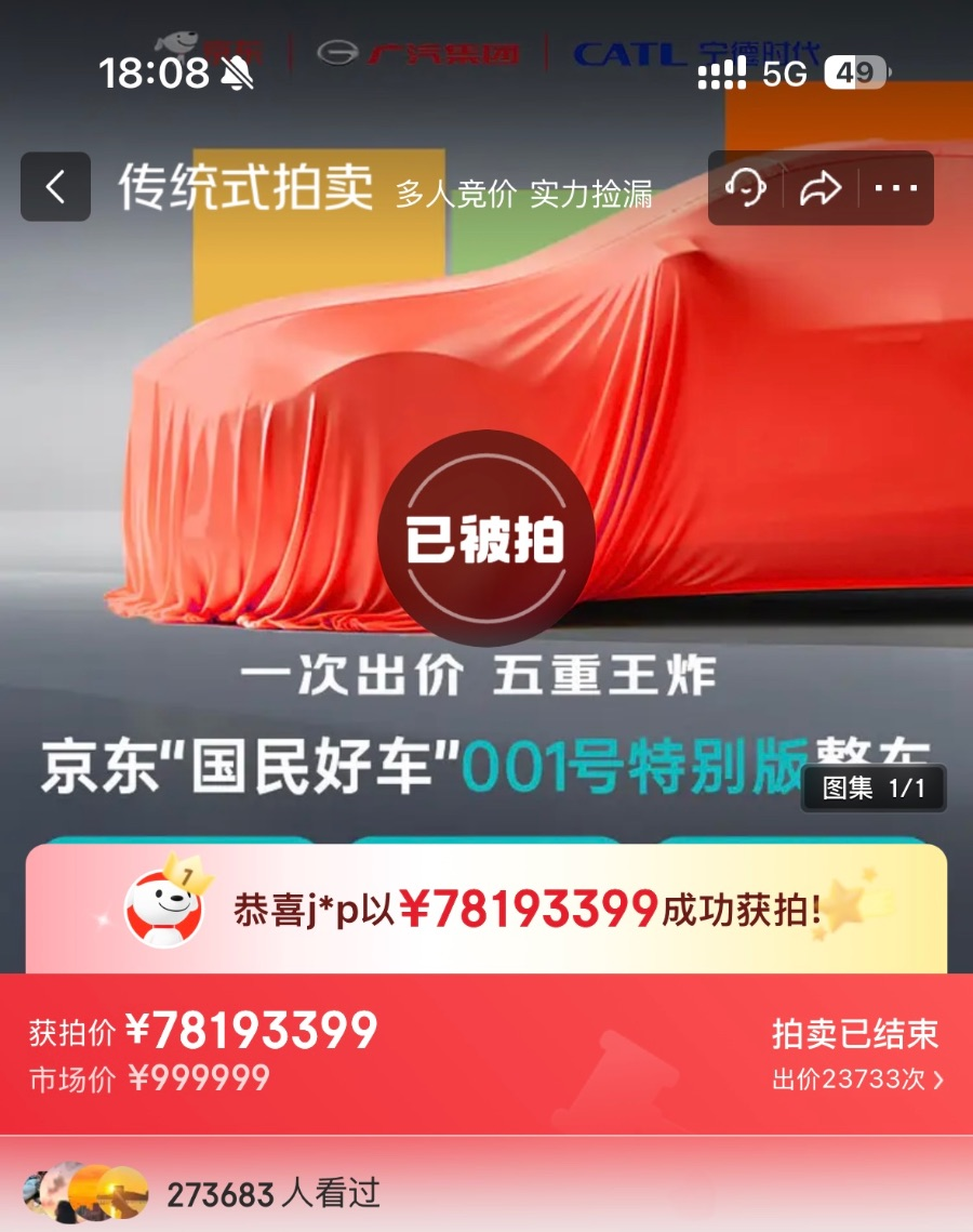 京東001號(hào)“國(guó)民好車”拍賣已結(jié)束,該活動(dòng)出價(jià)超23000次,吸引了近30萬(wàn)人圍觀,開拍不到一小時(shí),出價(jià)就超過(guò)了2500萬(wàn)元,最后以78193399元的天價(jià)結(jié)束競(jìng)拍。針對(duì)此次異常高價(jià)成交事件,京東方面表示,正在積極聯(lián)系該出價(jià)者。如果最終用戶未能完成支付,京東將結(jié)合具體情況對(duì)001號(hào)車輛做出妥善處理。據(jù)悉,該車將于京東11.11期間正式發(fā)布,車型采取“巧克力換電”模式,預(yù)計(jì)為廣汽埃安換電車型。