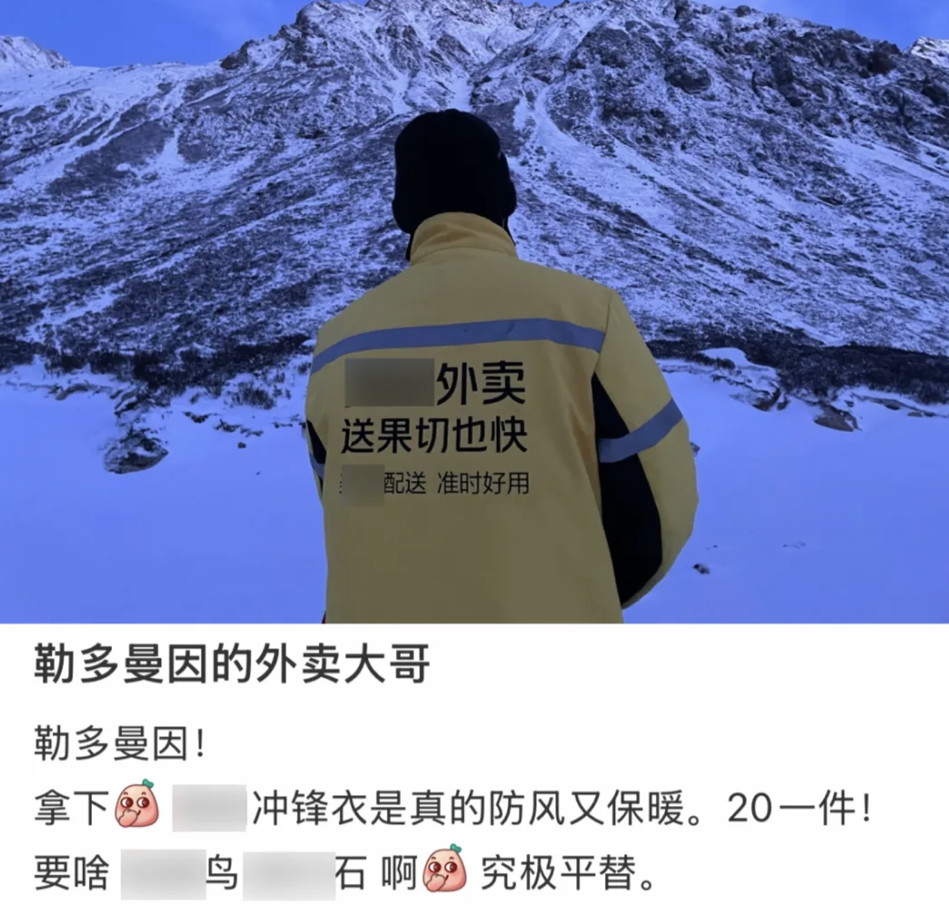今年降溫潮迅猛到訪(fǎng)之后,最有理有面兒的戶(hù)外中產(chǎn)們,反而拋棄了千元硬殼和萬(wàn)元鵝絨,開(kāi)始瘋搶起一種僅需三五十元的戶(hù)外戰(zhàn)袍——外賣(mài)騎手服。有網(wǎng)友表示:以前在各家戶(hù)外品牌里沒(méi)少摸爬滾打,現(xiàn)在返璞歸真,只有外賣(mài)服最寵自己。不光保住了錢(qián)包,還平和了心態(tài)。穿外賣(mài)服出游的風(fēng)潮,甚至刮到了國(guó)外。在最講究時(shí)尚的法國(guó),老外們滑雪時(shí)穿起了Uber Eats和皇家郵政的制服,東南亞最火爆的伴手禮不再是芒果干和冰箱貼,而成了當(dāng)?shù)赝赓u(mài)品牌Grab的配送服。