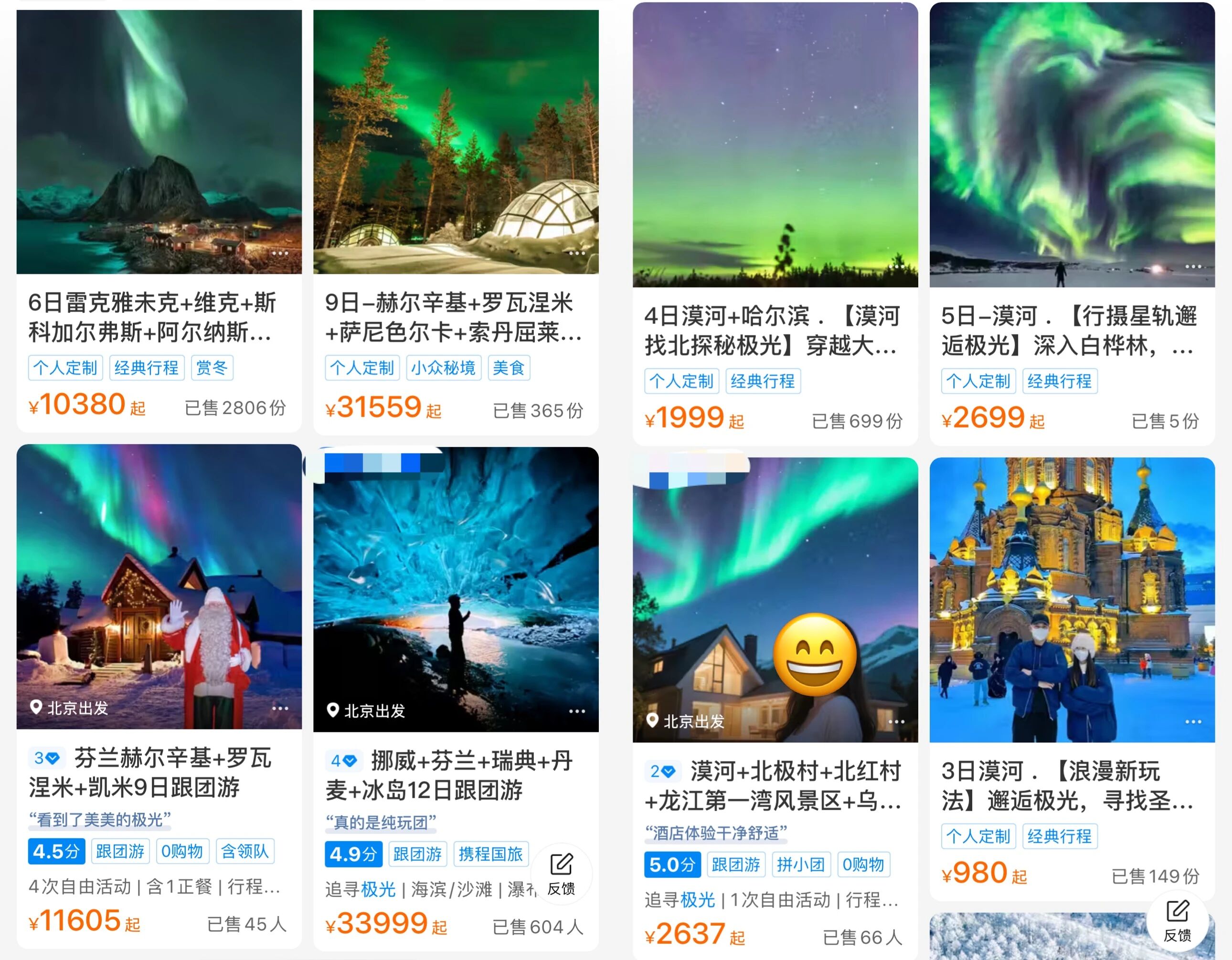 “這輩子必須要看一次極光”的心愿,大部分人一直惦記,卻從未行動。飛北歐耗時二三十個小時、高昂的花費(fèi)、五天起步的奢侈長假,都是讓愿望一再擱置的現(xiàn)實(shí)理由。如今,“國產(chǎn)極光”終于把價格打了下來。新疆阿勒泰、內(nèi)蒙古呼倫貝爾、黑龍江漠河,由于占據(jù)高緯度地理優(yōu)勢,榮升為了“國產(chǎn)極光三大圣地”,出行價格僅3千上下,縮減到了北歐游的十分之一,且不用準(zhǔn)備簽證和長假,過去和“小眾高端”劃等號的“追光旅行”被踏碎門檻,成了國內(nèi)游的香餑餑。