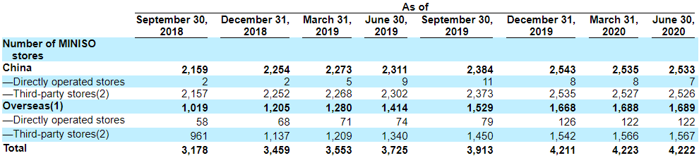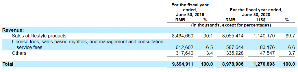 構(gòu)成營業(yè)收入的兩個最大來源,一是來自商品的銷售,二是來自向加盟商收取的費用。截至2020年6月30日,商品銷售收入為81億元,占比89.7%,向加盟商收取的“許可費,基于銷售的特許權(quán)使用費以及管理和咨詢服務(wù)費”為5.9億元,占比6.6%。