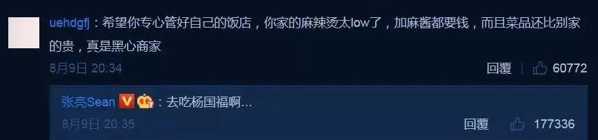 再比如今年#楊國(guó)福邀請(qǐng)張亮代言#的微博話題登頂熱搜。起因是一位網(wǎng)友在藝人張亮的微博下吐槽“張亮麻辣燙”存在加麻醬收費(fèi)、菜品貴等諸多問(wèn)題,讓他多管管。
