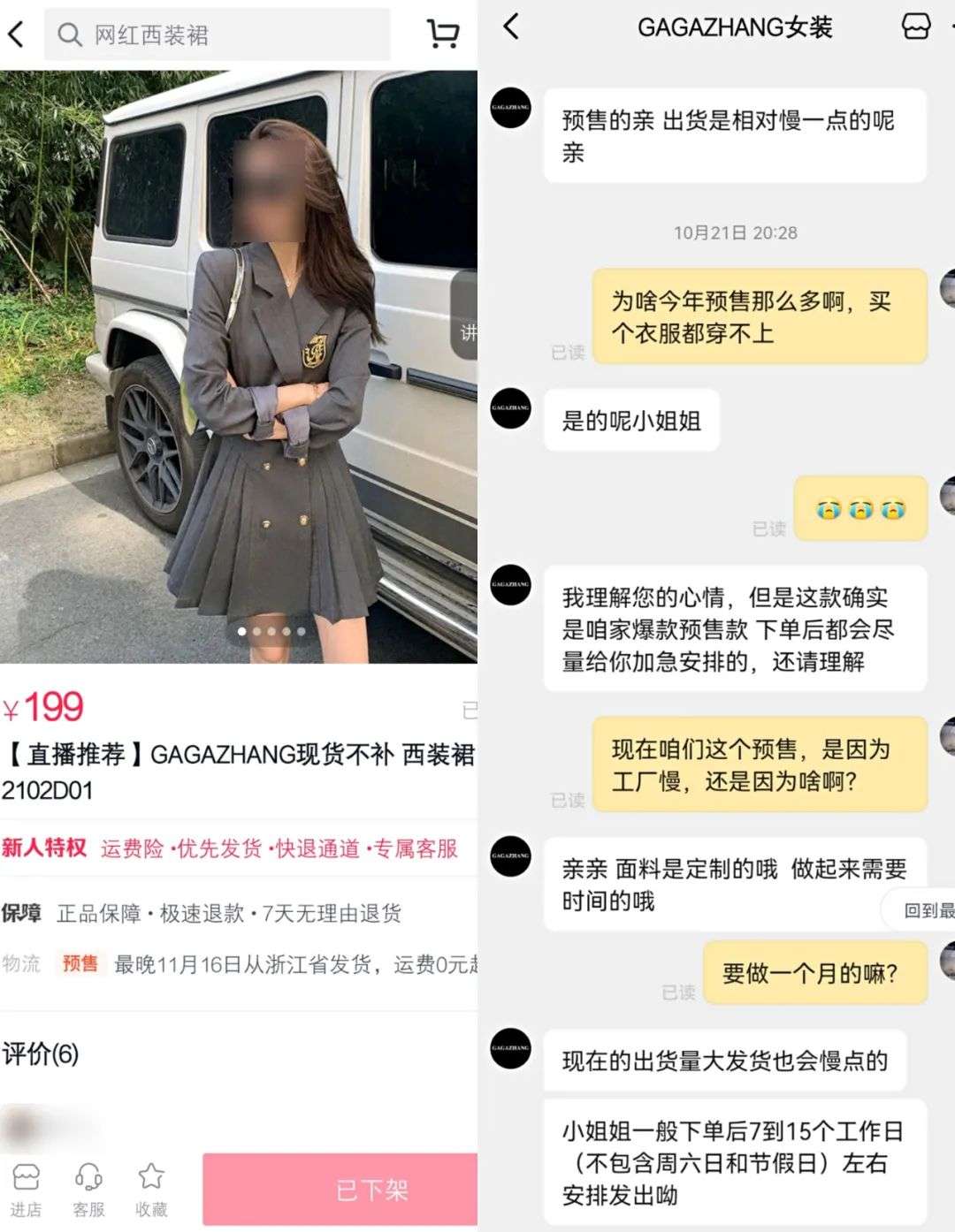 更令大花覺(jué)得吊詭的是,許多“三坑”店鋪都有現(xiàn)貨了,而她關(guān)注的很多日常服裝店鋪竟然搞起了預(yù)售?!拔谊P(guān)注的五家賣(mài)‘常服’的店鋪,有幾百萬(wàn)粉絲的那種大店,其中三家都在搞預(yù)售。有的是新款,我也理解,畢竟我等‘三坑’等習(xí)慣了。但前幾天我問(wèn)了一件8月份上的舊款,也是預(yù)售,下單后25天內(nèi)才能發(fā)貨,這就不是很合理了?!?/span>