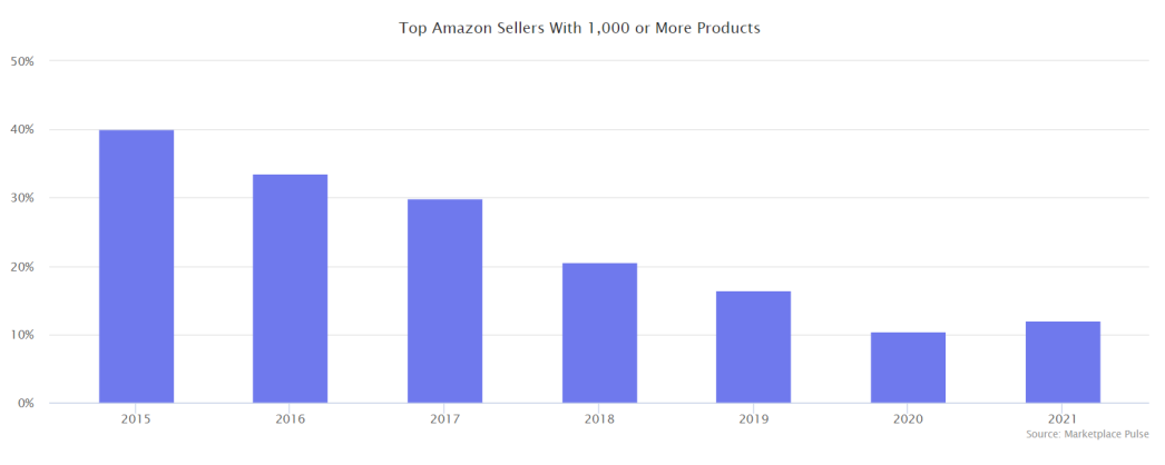 2021年,在售商品超過(guò)1000個(gè)的Top賣(mài)家僅占12%左右,而在2015年,大約33%的Top賣(mài)家在售商品超過(guò)1000。