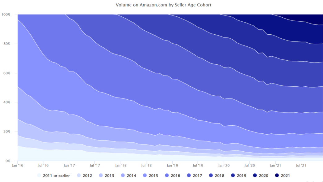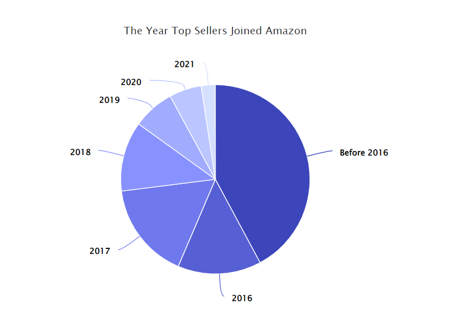 目前在亞馬遜上活躍的賣(mài)家,其最大的主體是在2017年之前就開(kāi)了店的老賣(mài)家。