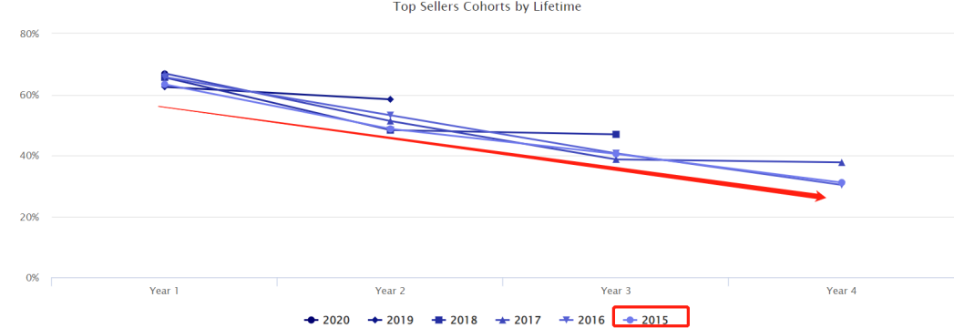 據(jù)MarketplacePulse統(tǒng)計(jì), Top10000名(排名前一萬(wàn))的賣(mài)家,三年之后,至少40-45%依然還活躍在亞馬遜上的。同時(shí),50-55%的Top10000的賣(mài)家,在二年依然在排在一萬(wàn)名以?xún)?nèi)。