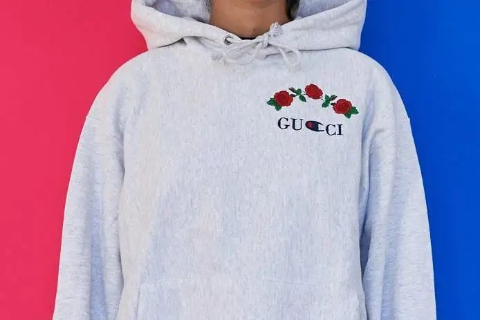 Ava 最初以 DIY(惡搞)奢侈品牌盜版聯(lián)名單品而出名,在品牌 LOGO 上大做文章,較早期 2016 年Gucci x Champion 的盜版繡花衛(wèi)衣,并在個人社交媒體上限量發(fā)行 10 件,并火速售罄。