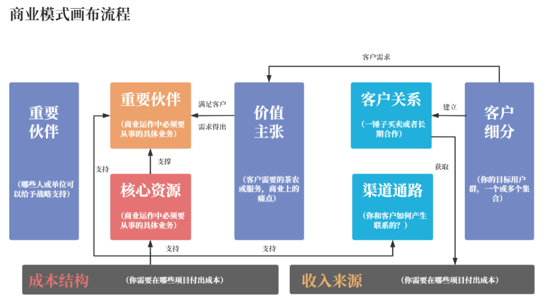 關(guān)鍵資源:實現(xiàn)客戶價值的差異化競爭優(yōu)勢,確保能為客戶創(chuàng)造價值,同時也能為公司創(chuàng)造價值,如人員、技術(shù)或產(chǎn)品、設(shè)備或信息、渠道或合作伙伴、品牌、流量等。