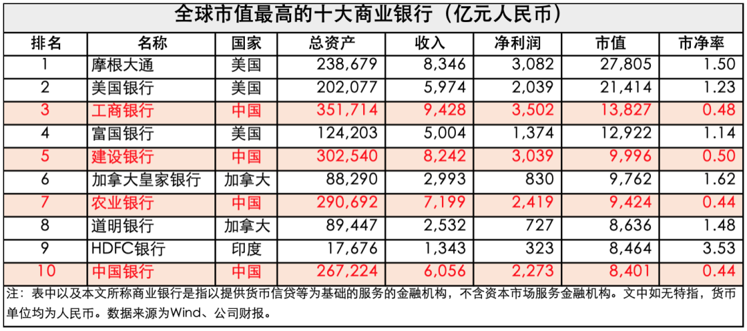 上述種種因素最終會(huì)被映射到上市商業(yè)銀行的市值上?!栋蛡愔芸分形陌鎸?duì)于當(dāng)前全球市值規(guī)模前十的商業(yè)銀行進(jìn)行了系統(tǒng)梳理,發(fā)現(xiàn)兩個(gè)較為典型的特點(diǎn)。