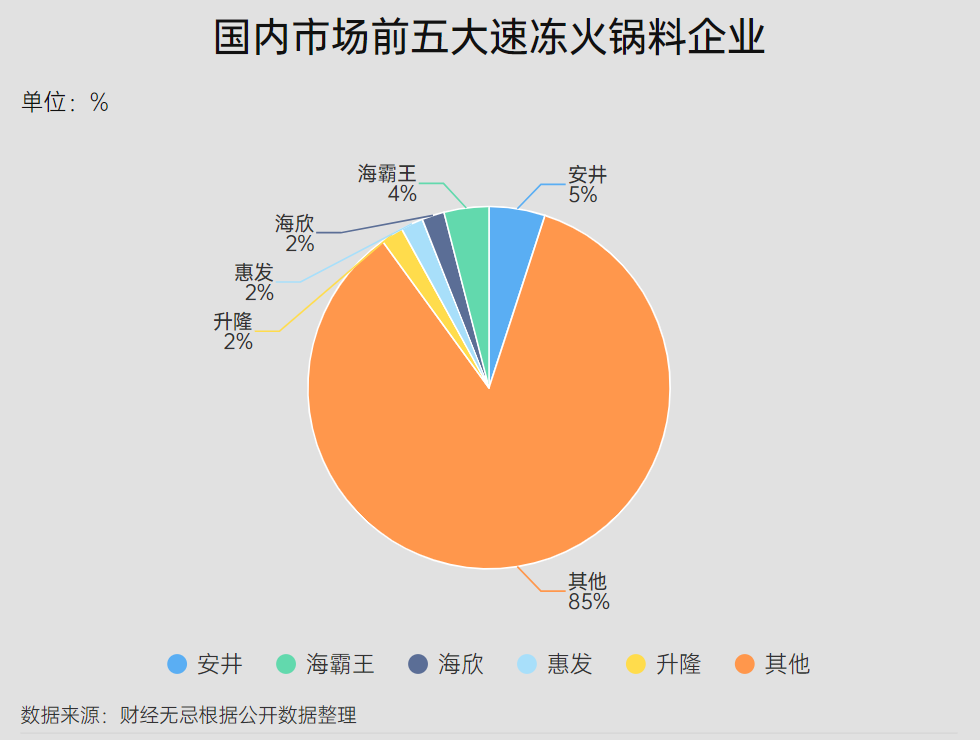 火鍋料市場盡管作為速凍食品的增量,但根據(jù)國聯(lián)證券的研究報告,其市場分散性依舊很強。國內(nèi)市場前五大速凍火鍋料企業(yè)分別為安井、海欣、海霸王、惠發(fā)和升隆,其中安井也僅占據(jù)市場5%左右的份額,排名第二的海霸王占比已達(dá)到4%。
