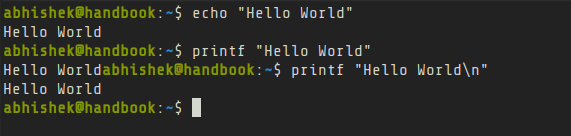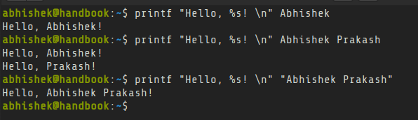 $ printf "Hello, %s! \n" Abhishek Prakash