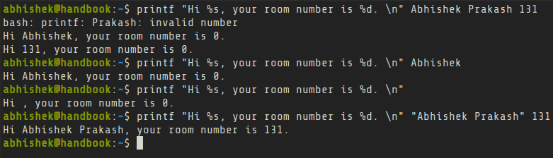 printf "Hi %s, your room number is %d. \n" Abhishek Prakash 131