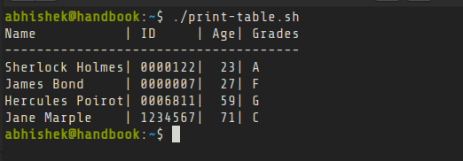 printf "$rows" "Sherlock Holmes" 122 23 A