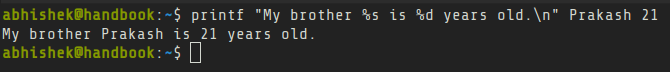 在上面的例子中 printf "My brother %s is %d years old.\n" Prakash 21,前面的語句 "My brother %s is %d years old.\n" 是格式,后面的 Prakash 和 21 是參數(shù),這些參數(shù)用于替換前面格式中的占位符 %s 和 %d。