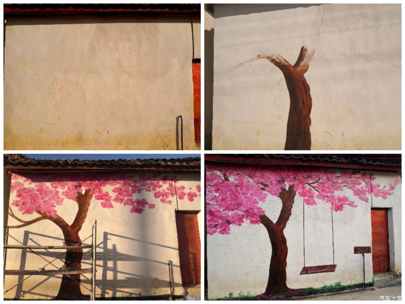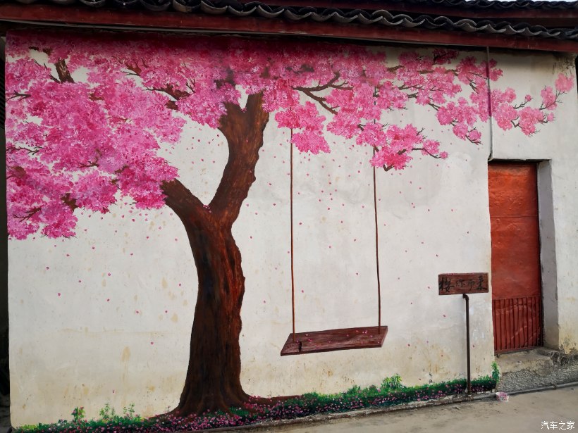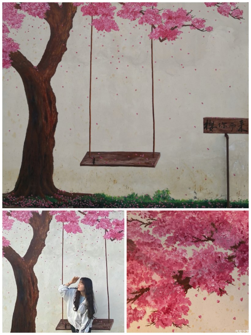 用“墨染櫻飛”這個(gè)詞,如果你到現(xiàn)場(chǎng)將會(huì)覺得非常貼切。眼前的這幅櫻花圖,這我根據(jù)墻面的裂痕,獨(dú)立創(chuàng)作的作品,仔細(xì)看依然能看到樹干上明顯的裂痕。漫天散落的櫻花,或?yàn)⒙湓诖謮训臉涓缮稀⒒驗(yàn)⒙湓谏钌那锴Ю?,?dāng)然,也可以是在你的手上,游客們特別喜歡坐在秋千上接住散落的櫻花,感受別樣的浪漫。