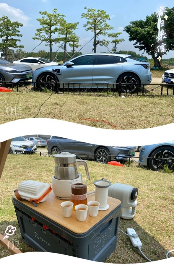 提車過幾天后,就組織了一場(chǎng)心心念念的露營,畢竟我們的極氪001就一個(gè)露營神器,寬大的后尾廂裝下了我早早就購買好的露營裝備,一家人開開心心驅(qū)車到郊外。特地找個(gè)地方把車停在旁邊,然后第一次使用上放電槍,拿出極氪的儲(chǔ)物箱和極氪立方送的差距,接上電水壺,泡上了一壺茶。再帶上一個(gè)空氣炸鍋,就能在戶外做各種美食,我喜歡買一些預(yù)制品,放進(jìn)空氣炸鍋幾分鐘后就有熱辣的美食出來了,非常的方便。