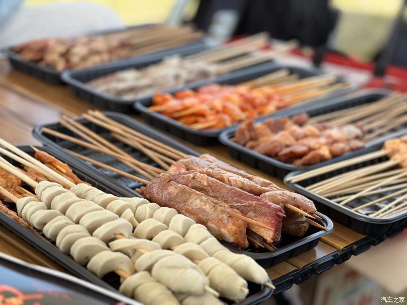 露營怎么能不搭配一些燒烤呢?找了朋友的燒烤店特意搞了很多串,天幕之下,烤起來~