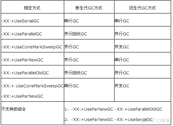 以上各種GC機(jī)制是需要組合使用的,指定方式由下表所示:
