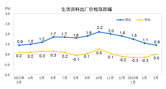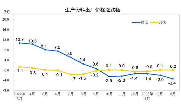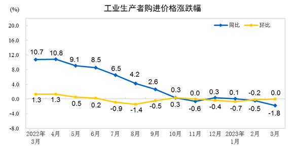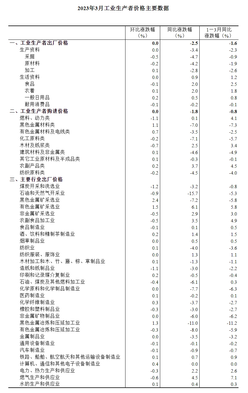 2023年3月份,全國工業(yè)生產(chǎn)者出廠價格同比下降2.5%,環(huán)比持平;工業(yè)生產(chǎn)者購進價格同比下降1.8%,環(huán)比持平。一季度,工業(yè)生產(chǎn)者出廠價格比去年同期下降1.6%,工業(yè)生產(chǎn)者購進價格下降0.8%。