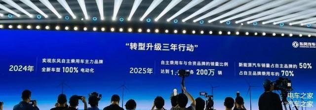 日前,電車之家了解到2023東風(fēng)汽車品牌春季發(fā)布會(huì)暨第七屆科技創(chuàng)新周在武漢舉行。發(fā)布會(huì)上東風(fēng)汽車表示,到2024年,東風(fēng)自主乘用車主力品牌全新車型實(shí)現(xiàn)100%電動(dòng)化;到2025年,自主乘用車與合資品牌銷量比例達(dá)到1:1,銷量各達(dá)到200萬(wàn)輛;同時(shí),新能源汽車銷量占到自主品牌的50%,占到自主品牌乘用車的70%。