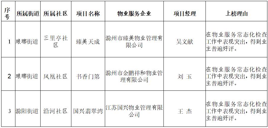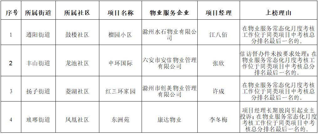 為加強物業(yè)服務(wù)企業(yè)監(jiān)管,提升物業(yè)服務(wù)水平,按照《滁州市物業(yè)服務(wù)企業(yè)信用檔案管理實施細則》(建物〔2021〕62號)和《關(guān)于建立住宅小區(qū)物業(yè)服務(wù)項目“紅黑榜”制度的通知》(瑯住建交〔2023〕23號)有關(guān)規(guī)定,結(jié)合各街道月度考核、區(qū)級物業(yè)主管部門周巡查和物業(yè)服務(wù)日常監(jiān)督管理情況,將滁州市臻美物業(yè)管理有限公司等3個物業(yè)服務(wù)項目列入“紅榜”(附件1),將滁州水石物業(yè)有限公司等4個物業(yè)服務(wù)項目列入“黑榜”(附件2),現(xiàn)予以通報。