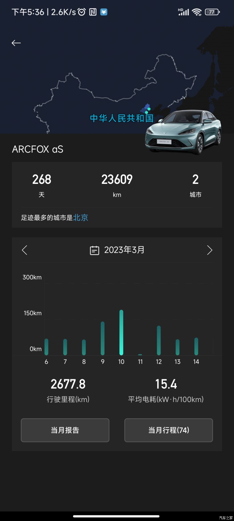 提車快9個月,總行駛里程2萬3多,基本上每月能跑個2千公里??傮w來看,三月總共行駛2600多公里,總電耗15.4kwh/km,應(yīng)該是相當(dāng)于8折。能維持在一周半一充,因為周末要回密云或者房山,來回近200公里!每天通勤上下班還要80公里!因為周五晚上回家,一般是周四晚上去附近充電樁沖個半小時,到90%以后就可以順利回家往返了。
