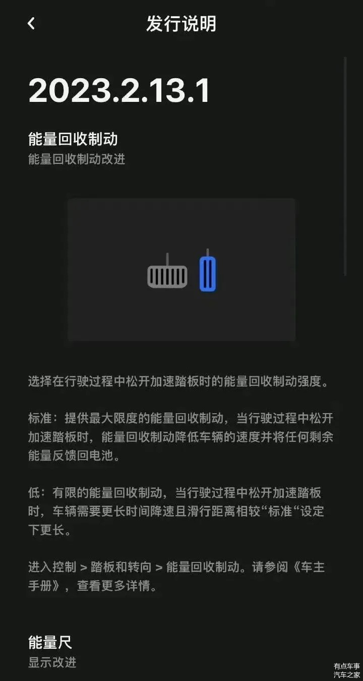 日前,特斯拉也發(fā)布了關(guān)于OTA2023.2.13.1的相關(guān)說(shuō)明,其中本次系統(tǒng)升級(jí)最大的亮點(diǎn)在于對(duì)能量回收制動(dòng)系統(tǒng)進(jìn)行改進(jìn),用戶可以選擇在行駛過(guò)程中松開(kāi)油門(mén)時(shí)的能量回收制動(dòng)的強(qiáng)度。