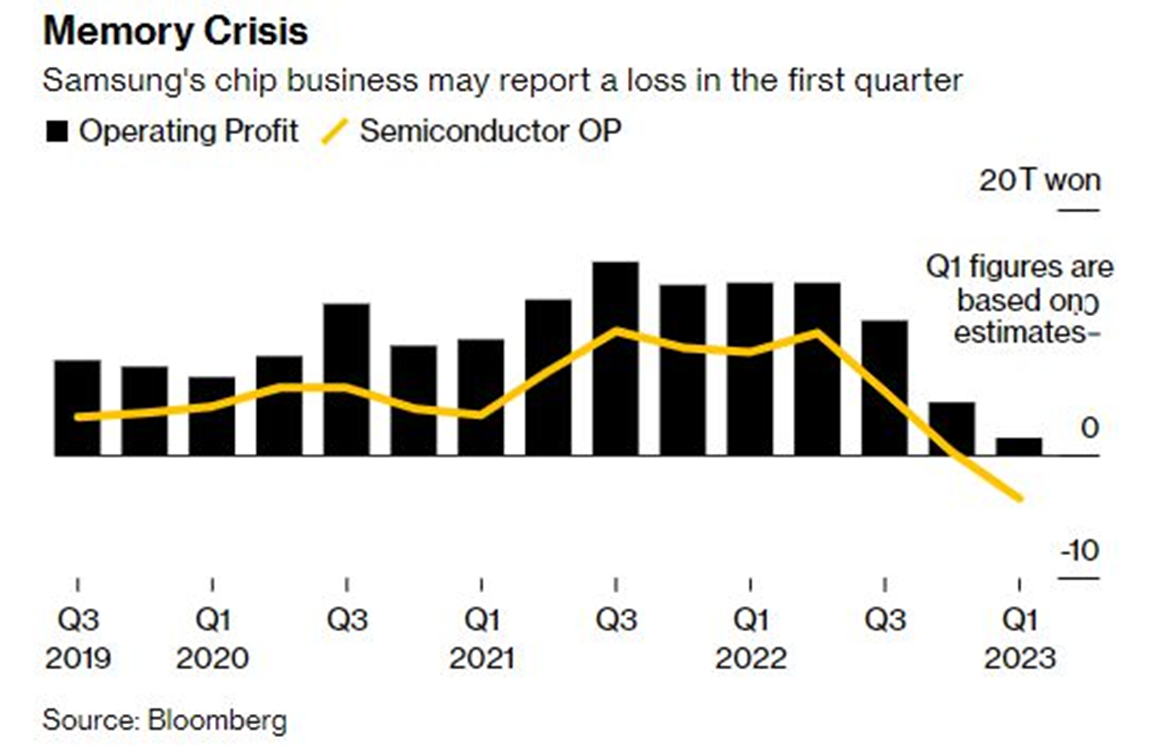 上周五,三星公布初步業(yè)績(jī),由于芯片供過于求情況惡化、全球經(jīng)濟(jì)放緩,買家放慢購(gòu)買速度,今年一季度利潤(rùn)或大幅下滑96%,為2009年全球金融危機(jī)以來新低。三星暫未公布具體業(yè)務(wù)利潤(rùn),不過外媒預(yù)估,三星Q1內(nèi)存芯片虧損或高達(dá)30億美元。