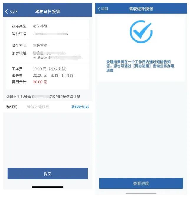 步驟四:取件方式、支付方式確認后,點擊【下一步】,進入駕駛證補換領提交頁面,再次確認所填資料信息無誤后,獲取手機短信驗證碼,核驗通過后,點擊【提交】按鈕,完成駕駛證補換領業(yè)務申請信息提交。