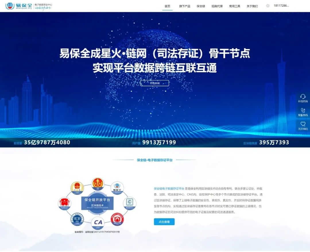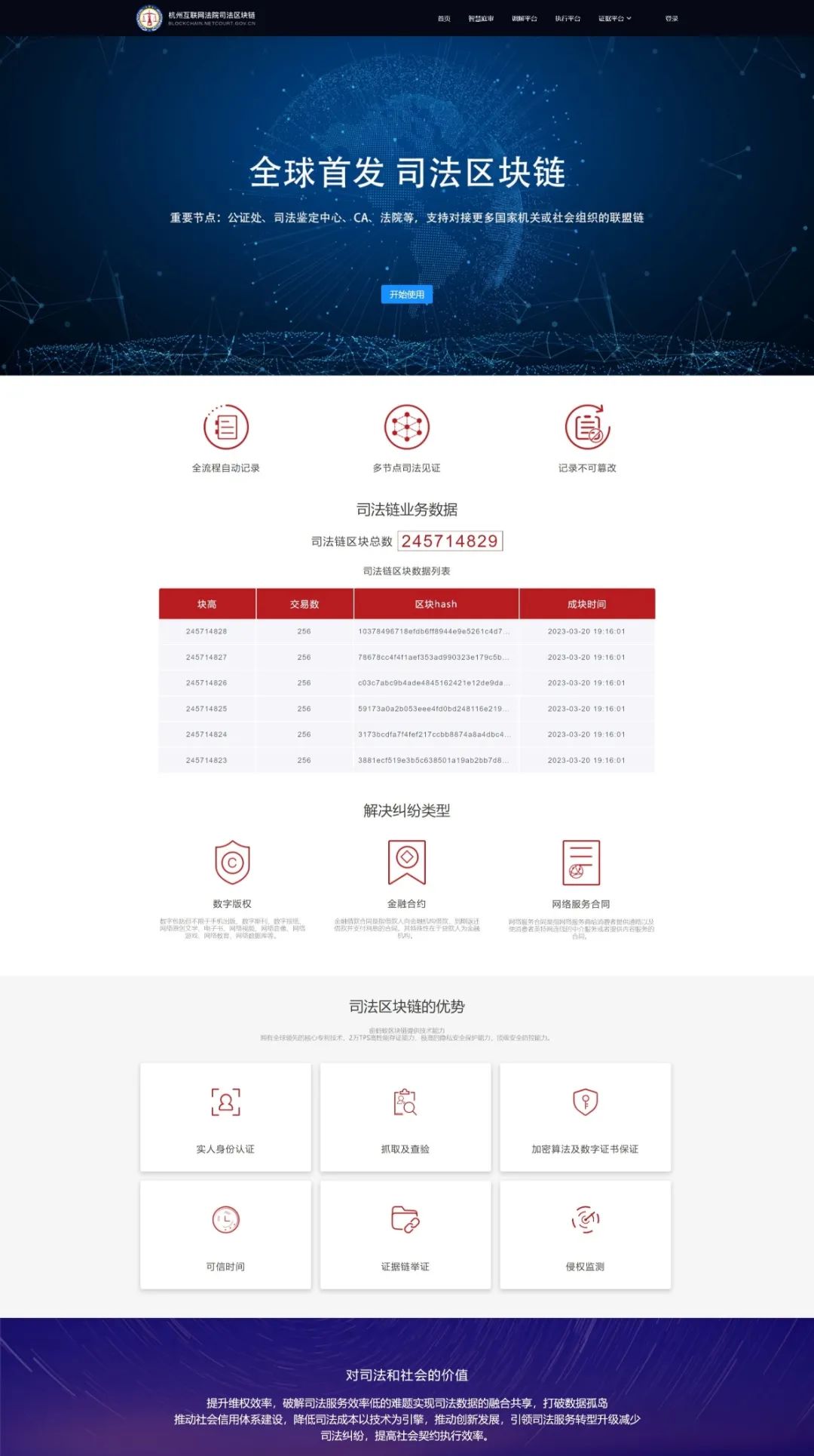 比如常見的存證平臺(tái)的網(wǎng)站頁面,會(huì)突出顯示平臺(tái)采用區(qū)塊鏈技術(shù)提供服務(wù)。下圖為杭州互聯(lián)網(wǎng)法院開發(fā)的區(qū)塊鏈平臺(tái)頁面,列明了采用區(qū)塊鏈技術(shù)的特性和平臺(tái)規(guī)模等信息。
