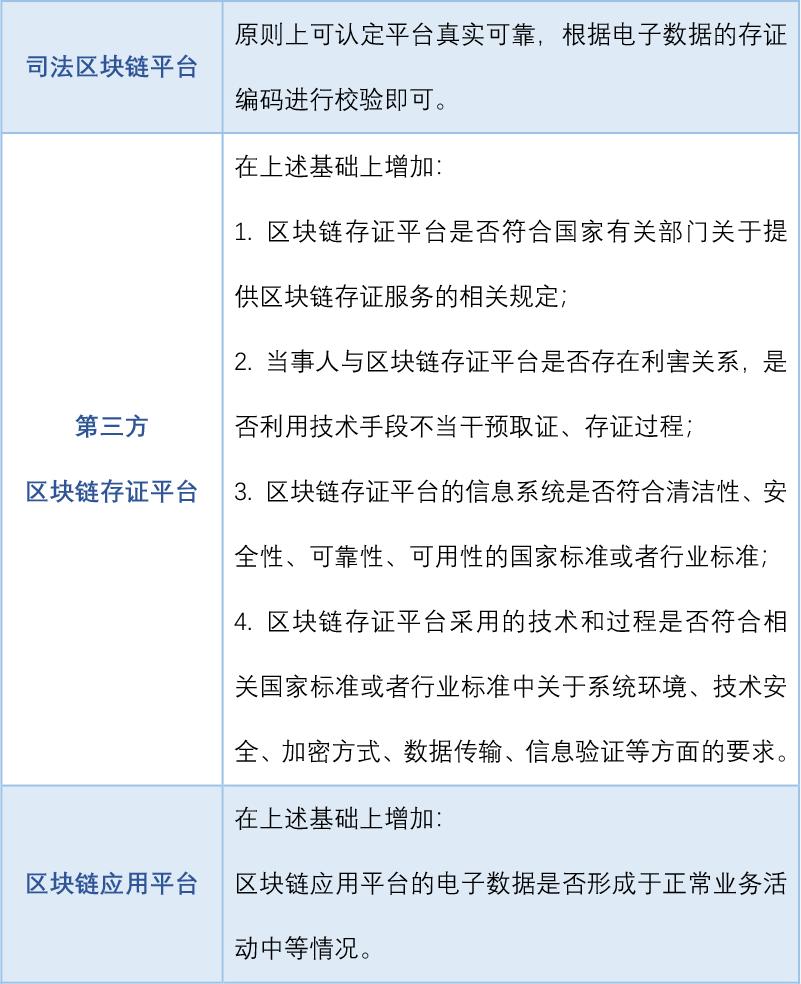 為便于實(shí)踐操作、提高審查認(rèn)定的效率,可分為司法區(qū)塊鏈平臺(tái)、第三方區(qū)塊鏈存證平臺(tái)、區(qū)塊鏈應(yīng)用平臺(tái)三種類型,對照相關(guān)的審查要點(diǎn)。