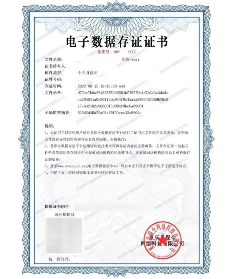 通常,在存證平臺(tái)存儲(chǔ)的文件數(shù)據(jù),可以生成存證證書,載明文件名稱、存證時(shí)間、文件哈希值等內(nèi)容。