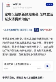 4月9日,中國之聲推送《家電以舊換新熱潮來襲 怎樣激活城鄉(xiāng)消費新動能?》,關(guān)注金華家電市場銷售回暖。