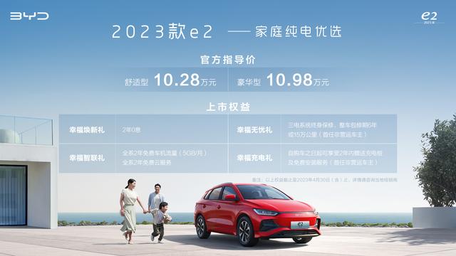4月6日,比亞迪2023款e2煥新上市,售價10.28萬元-10.98萬元。據(jù)了解,4月30日前,訂購該車型的用戶可享受包括2年0息,全系2年免費車機流量(5GB/月),三電系統(tǒng)終身保修等多重權(quán)益大禮。2023款e2是專為追求品質(zhì)生活的家庭用戶打造的純電優(yōu)選,憑借設(shè)計煥新、技術(shù)升級、智能進階,將為更多家庭用戶提供更時尚、更高效、更舒適的綠色出行新體驗。
