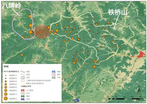 鐵橋山保護區(qū)和八縛嶺保護區(qū),之間的紅色陰影便是兩個保護地之間的重要廊道,是構成這個種群棲息地保持完整的關鍵。?貓盟