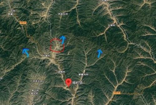 橫嶺鎮(zhèn)的天然廊道,東邊是鐵橋山保護區(qū),西邊是八縛嶺保護區(qū),藍色箭頭指出了溝通兩個區(qū)域的山脊。紅色圈是上北舍村的位置。?貓盟