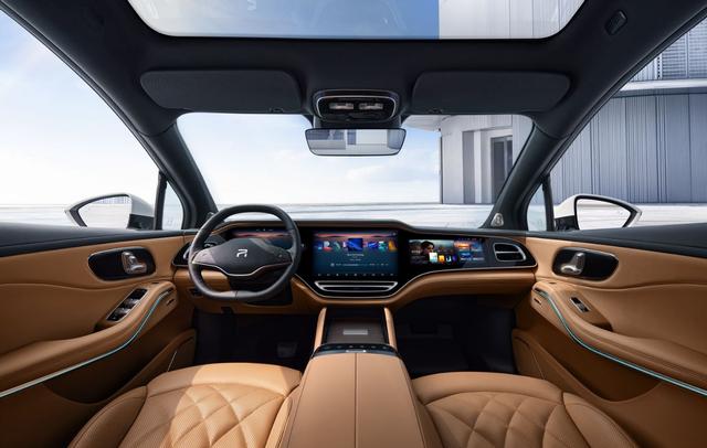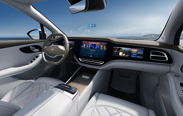 座艙內(nèi)部,中控臺(tái)主要由RISING MAX-3+1霸艙式巨幕構(gòu)成,包含了AR-HUD、10.25英寸儀表屏、15.05英寸中控屏以及12.3英寸副駕屏,它內(nèi)置了RISING OS操作系統(tǒng),在常規(guī)情況下,中控屏可以和副駕駛屏實(shí)現(xiàn)獨(dú)立操作,互不干擾,比如在一家人出行途中,中控屏可以用于導(dǎo)航,副駕駛屏則可以播放視頻或者進(jìn)行其它娛樂活動(dòng),讓出行途中不乏味。中控屏與副駕駛屏幕也可以支持三指拖拽,實(shí)現(xiàn)相互分享視頻;還有一個(gè)功能我覺得非常實(shí)用,在行車過程中,老人或者小孩需要上廁所,副駕駛乘客直接就能在副駕駛屏幕上添加“加油站”為途經(jīng)點(diǎn),然后同步到儀表屏或者中控屏上。