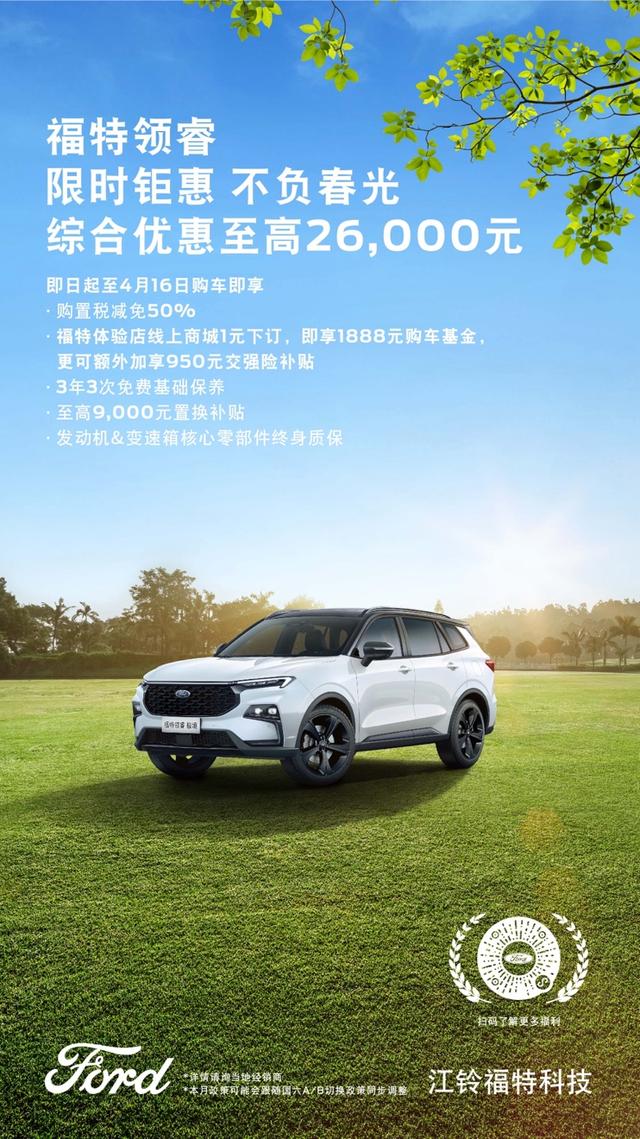 即日起至4月16日,用戶在【福特體驗(yàn)店】小程序1元下訂福特領(lǐng)睿,可享受1,888元的購(gòu)車基金等優(yōu)惠,更可額外加享950元交強(qiáng)險(xiǎn)補(bǔ)貼。綜合算下來(lái),福特領(lǐng)??上硎芷放品街粮?.6萬(wàn)元的綜合優(yōu)惠。