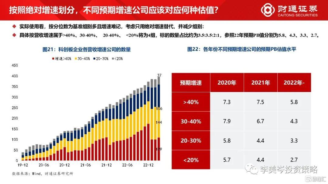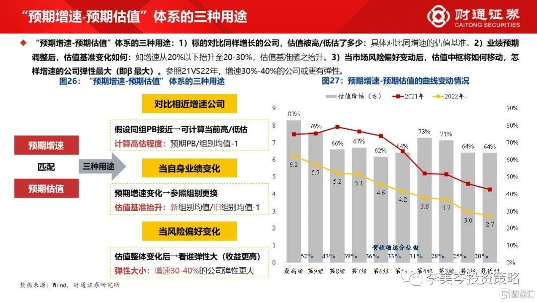 “預(yù)期增速-預(yù)期估值” 的3種用途:1)看標(biāo)的當(dāng)前相對同樣增長公司的高/低估情況:如標(biāo)的增速超40%,對應(yīng)預(yù)期PB均值為5.8,但公司預(yù)期PB為5,即還有16%上漲空間。2)業(yè)績預(yù)期調(diào)整后,估值基準(zhǔn)變化如何:如增速從20%以下抬升至20-30%,估值基準(zhǔn)從2.7抬升至3.3,估值中樞應(yīng)該上升22%;3)當(dāng)市場風(fēng)險(xiǎn)偏好變動后,估值中樞將如何移動,怎樣增速的公司彈性最大(即β最大)。參照21VS22年,增速30%-40%的公司或更有彈性。