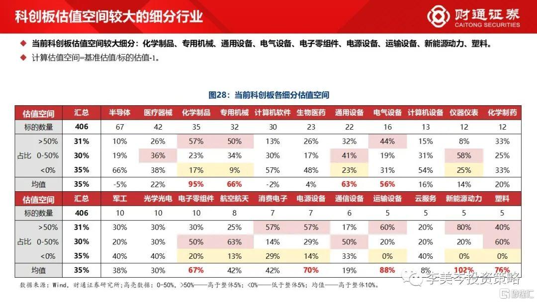 基于“預(yù)期增速-預(yù)期估值”,哪些行業(yè)和標(biāo)的處于低估狀態(tài)?計(jì)算估值空間=對應(yīng)基準(zhǔn)估值/當(dāng)前標(biāo)的估值-1。1)當(dāng)前科創(chuàng)板中,估值空間超50%的占31%,0-50%的占30%,小于0%(高于基準(zhǔn)估值的)占35%。2)細(xì)分看,以下估值空間較大:化學(xué)制品、專用機(jī)械、通用設(shè)備、電氣設(shè)備、電子零組件、電源設(shè)備、運(yùn)輸設(shè)備、新能源動力、塑料。3)梳理出估值空間50%以上的科創(chuàng)板標(biāo)的73只。