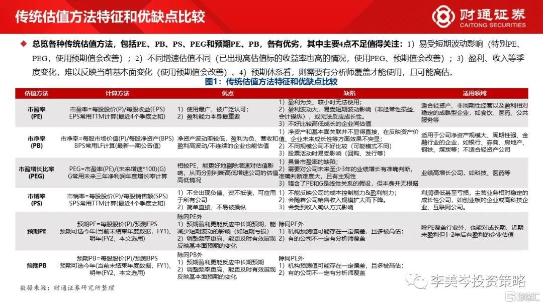 總覽各種傳統(tǒng)估值方法,包括PE、PB、PS、PEG和預(yù)期PE、PB,各有優(yōu)劣,其中主要4點(diǎn)不足值得關(guān)注:1)易受短期波動影響(特別PE、PEG,使用預(yù)期值會改善);2)不同增速估值不同(已出現(xiàn)高估值標(biāo)的收益率也高的情況,使用PEG、預(yù)期值會改善);3)盈利、收入等季度變化,難以反映當(dāng)前基本面變化(使用預(yù)期值會改善)。4)預(yù)期體系看,則需要有分析師覆蓋才能使用,且可能高估。