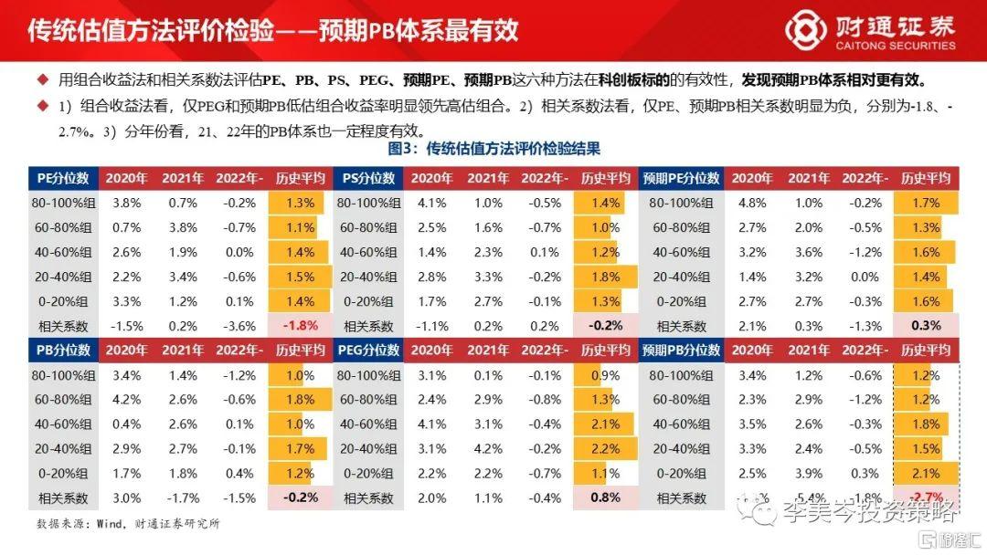 這些估值方法哪些更適配科創(chuàng)板?組合收益法+相關(guān)系數(shù)法,2種評價(jià)方法構(gòu)建評價(jià)體系:如果估值指標(biāo)合適,高估標(biāo)的后續(xù)價(jià)格更可能下跌,低估標(biāo)的后續(xù)價(jià)格更可能上漲。具體方法看:1)組合收益法:按當(dāng)前估值從高到低分為5組,如果下一個(gè)月收益和估值組別高低反向,則說明估值指標(biāo)有效;2)相關(guān)系數(shù)法:直接計(jì)算所有估值指標(biāo),當(dāng)前估值和下一個(gè)月收益率的相關(guān)系數(shù),并求歷史平均值,相關(guān)系數(shù)為負(fù)且絕對值越大,估值指標(biāo)越有效。